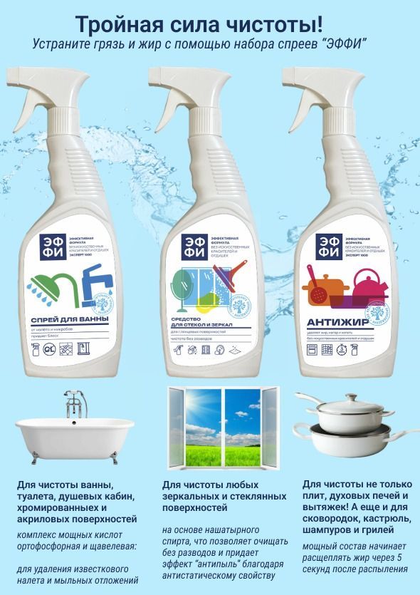 —Набор из 3-х моющих средств по 750мл ЭФФИ (спрей для ванны, для стекол и зеркал, антижир) 1/5