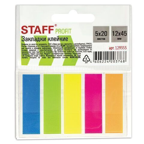 Закладки клейкие пластиковые 45х12мм 5цв.х20л неон STAFF 1/48 оптом и в розницу в Ижевске купить