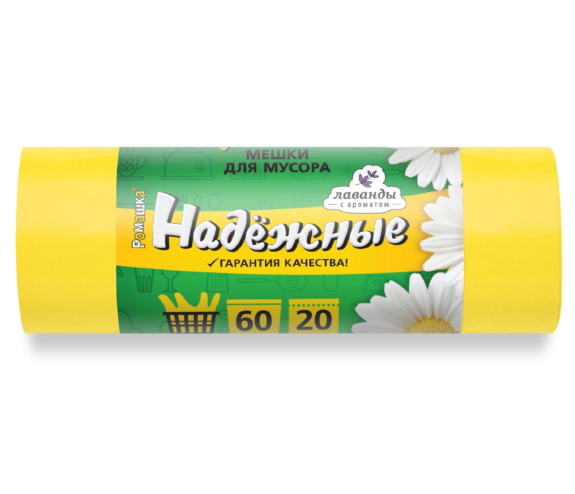 —Мешок для мусора 60л рулон ПСД (60х74)-15 желтые с ушками (НАДЕЖНЫЕ 12г Ромашка (20шт) 1/20