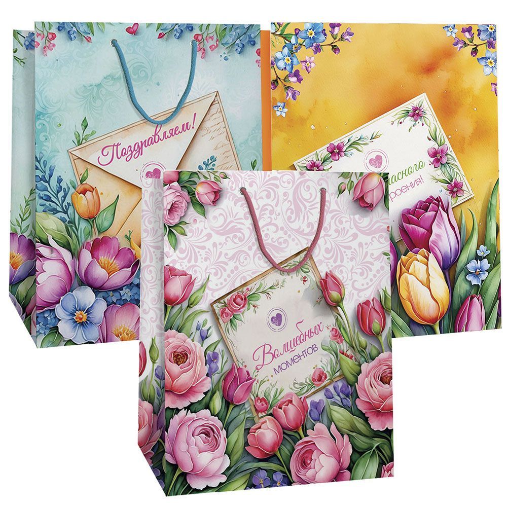 Пакет подарочный бумажный (18х23х10) ламинир Микс 3 дизайна 1/12/360 оптом и в розницу в Ижевске, цены в каталоге с доставкой